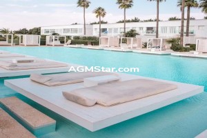Artificial beach with floating sunbeds and VR scuba simulators create resort-style living